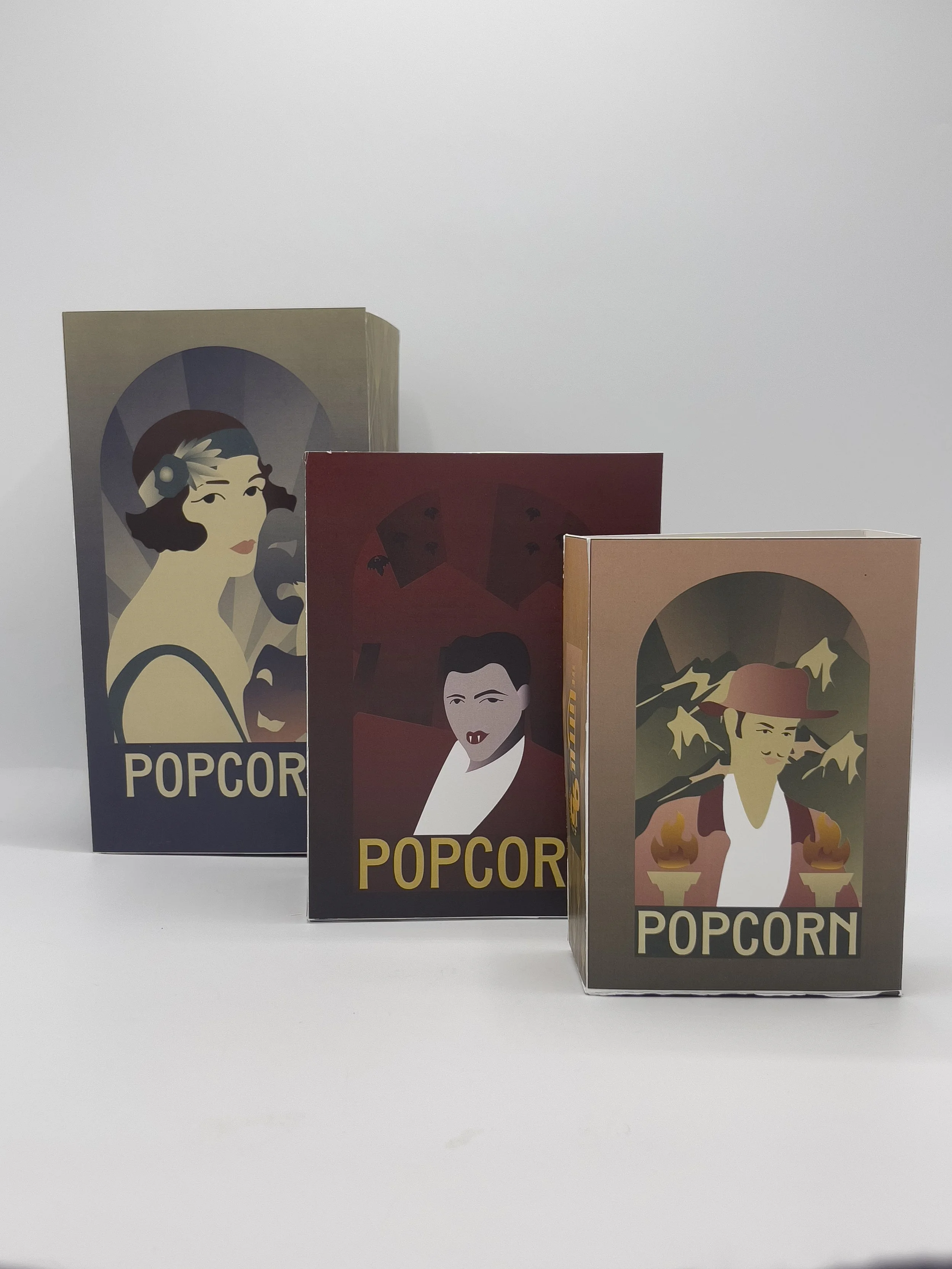 Create a system of collapsible popcorn containers for The Little Theatre in Rochester. This gem opened in 1929 and is one of the oldest, continually running small theaters in the US. Each container will have graphics that relate to a movie genre and will be related in style and systematic approach. Also, create a t-shirt design, a gift card, and two other promotional pieces that fit the system you have created.