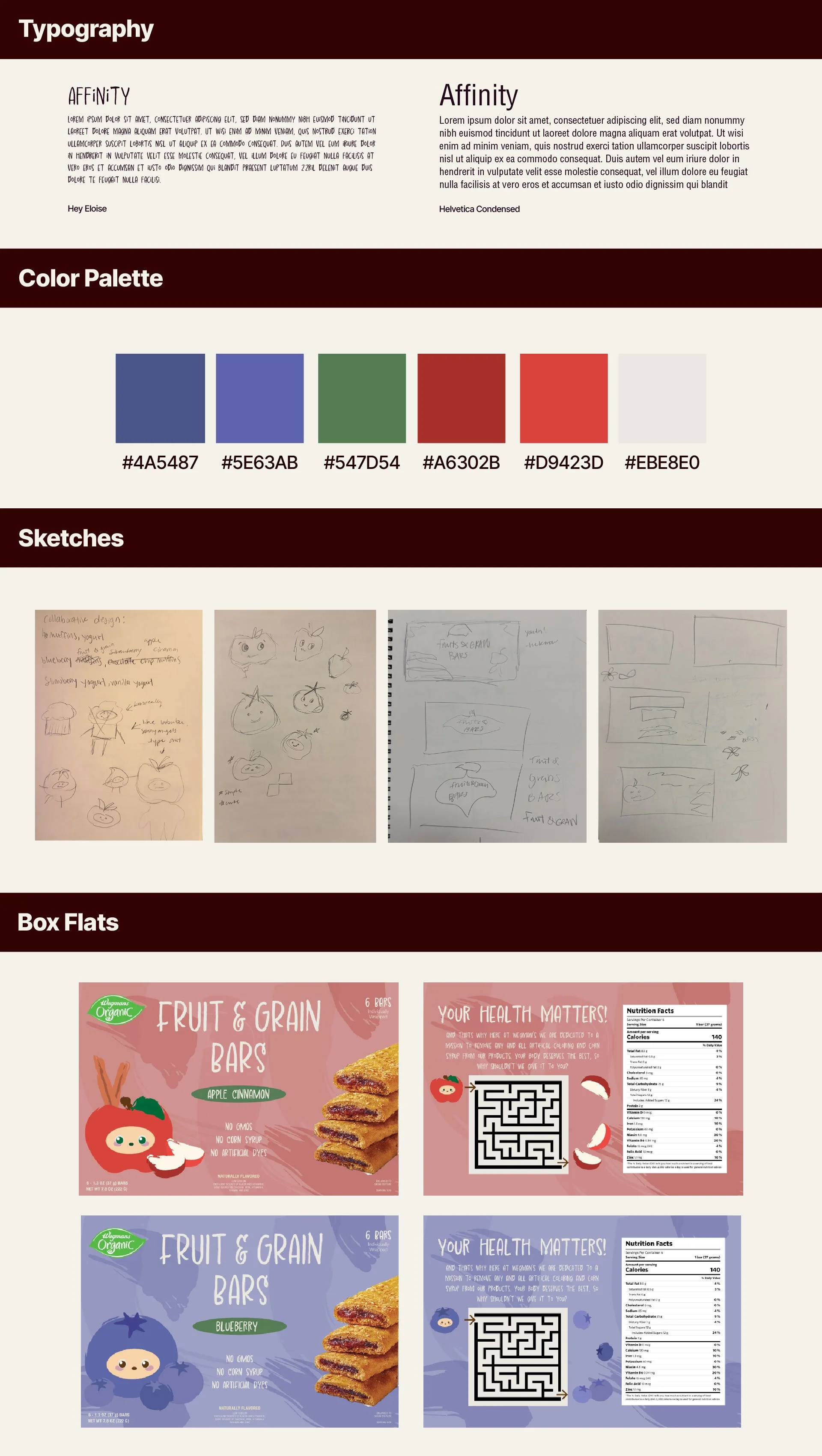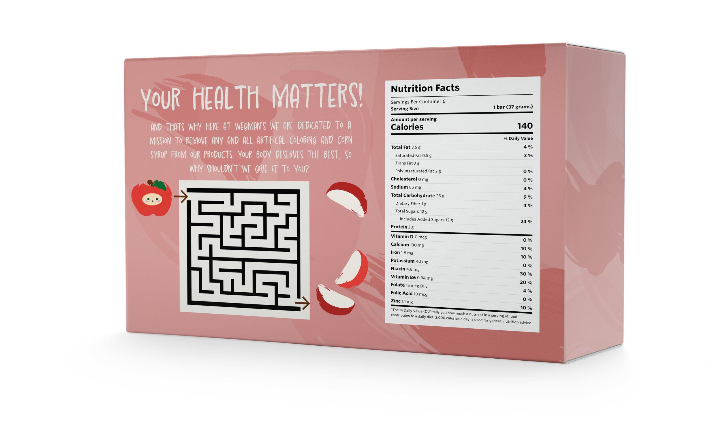 we were tasked with taking a breakfast food item from the grocery chain wegman’s and reimagining the packaging for a younger audience. we were challenged to promote the organic aspect to these products while still making them appealing for children and their parents.